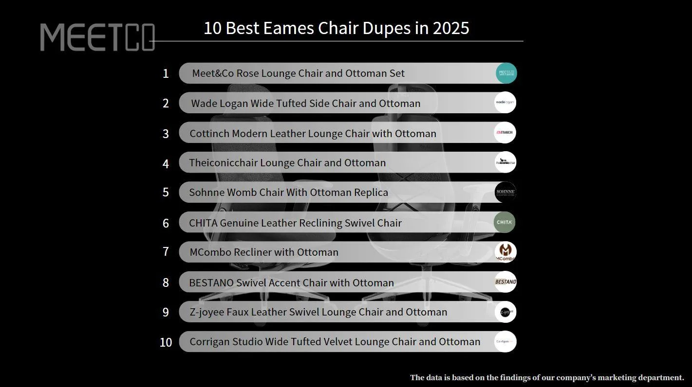 A poltrona Eames é um dos ícones mais reconhecidos do design moderno de meados do século. Sua versão original apresenta estofamento de couro premium, almofadas de pelúcia e uma base elegante com textura de madeira, incorporando elegância retrô atemporal. No entanto, seu preço de US$ 5,800 a torna fora do alcance de muitos compradores.